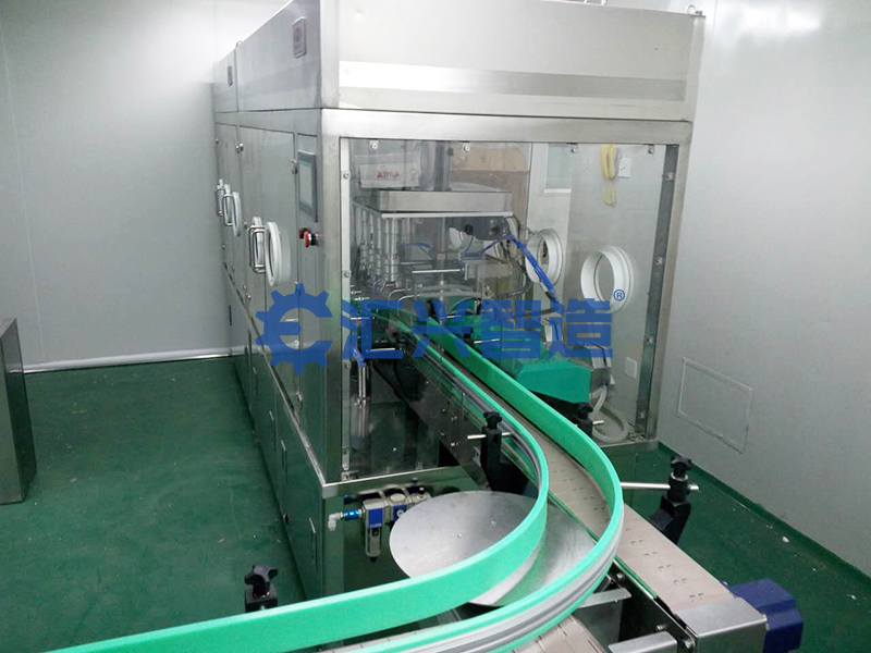 瓶子由撥輪旋轉送至沖瓶機構,瓶夾打開,夾住瓶口。瓶夾由導軌翻轉180°,使瓶口向下。將純水泵送至沖瓶機的分水盤,實現由下往上對瓶子內壁進行高壓沖洗,沖洗時間約為3-5s。沖洗結束后,再逆時針旋轉180°,將瓶子放下,由旋轉撥輪過度到灌裝部分。