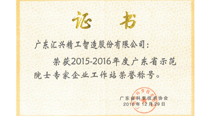 匯興智造榮獲2015-2016年度廣東省示范院士專家企業工作站榮譽稱號