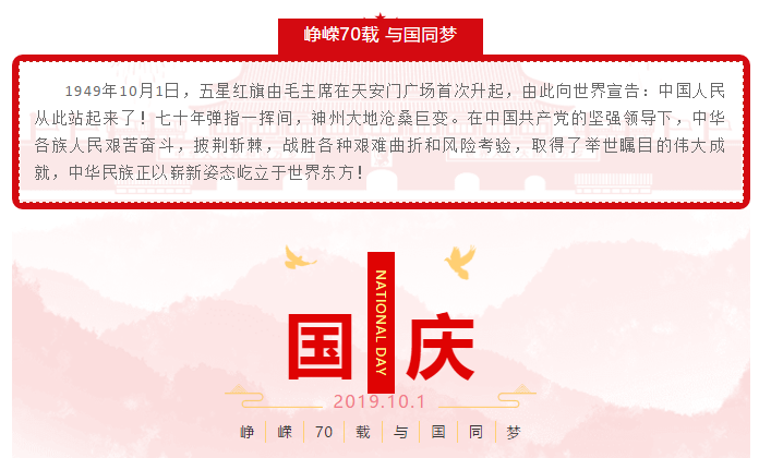 禮贊新中國,奮進(jìn)新時(shí)代!值此中華人民共和國成立70周年的美好時(shí)刻,讓我們共同祝愿我們偉大的祖國更加繁榮富強(qiáng)!祝愿我們偉大的人民更加幸福安康