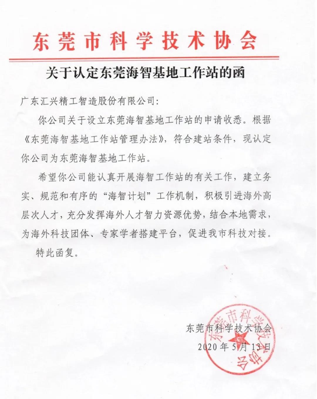 近日,東莞市科技協會公布了2020年度東莞海智基地工作站認定函,廣東匯興精工智造股份有限公司(簡稱:匯興智造)成功獲批!