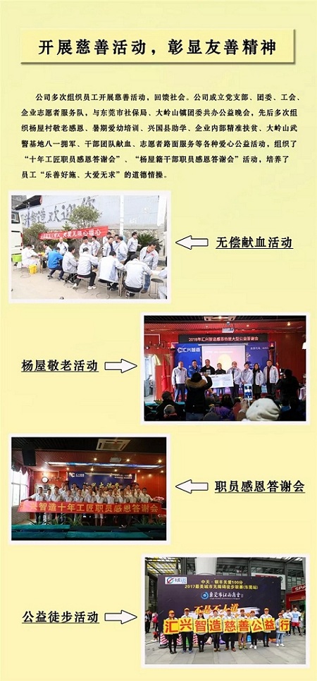 如果信念有顏色,那一定是中國(guó)紅!無(wú)償獻(xiàn)血是無(wú)私奉獻(xiàn)、救死扶傷的崇高行為,是我國(guó)血液事業(yè)發(fā)展的強(qiáng)大助力和保障。匯興智造作為東莞市首批10家“友善企業(yè)”之一,始終在堅(jiān)持以人為本,注重人文關(guān)懷的同時(shí),致力于將“友善”的價(jià)值觀、理念融入公司日常活動(dòng)中,通過(guò)快樂(lè)工作,幸福生活的獨(dú)具特色的“友善文化”和“一個(gè)行業(yè) 一個(gè)家庭 一所學(xué)校 一支軍隊(duì)”的人文理念,把社會(huì)主義核心價(jià)值觀融入到員工思想教育工作之中;夯實(shí)“友善企業(yè)”基礎(chǔ)、打造“友善環(huán)境”陣地、構(gòu)建友善勞動(dòng)關(guān)系。在點(diǎn)點(diǎn)滴滴中融合、滲透,全方位落地生根,營(yíng)造和諧友善氛圍和人文環(huán)境,積極提升員工的幸福感和自豪感,讓員工在公司平臺(tái)上充分展現(xiàn)自我,實(shí)現(xiàn)自身價(jià)值,創(chuàng)享更加美好的生活。